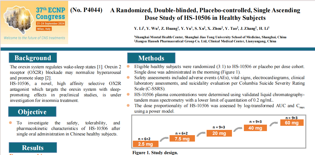 On September 21-24, the 37th Congress of the European College of Neuropsychopharmacology (ECNP) was held in Milan, Italy. The latest clinical research data on Hansoh Pharma's HS-10506, a novel, high-affinity selective orexin-2 receptor (OX2R) antagonist, were presented in the form of a poster at the conference, with insomnia as its potential indication.